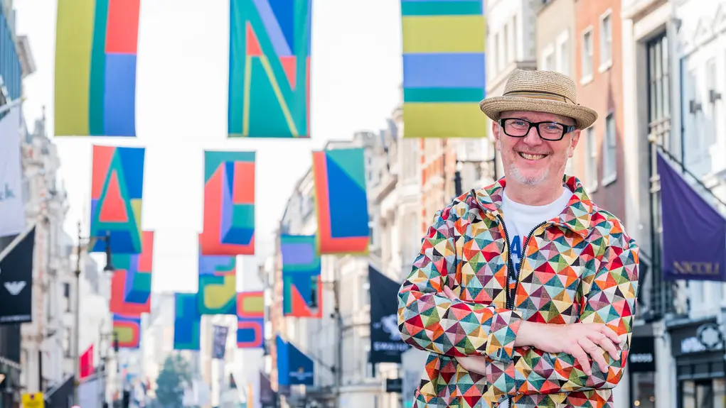 See Mayfair's historic streets transformed with colourful art flags designed by British contemporary artist Bob and Roberta Smith, who is known as using text as an art form.