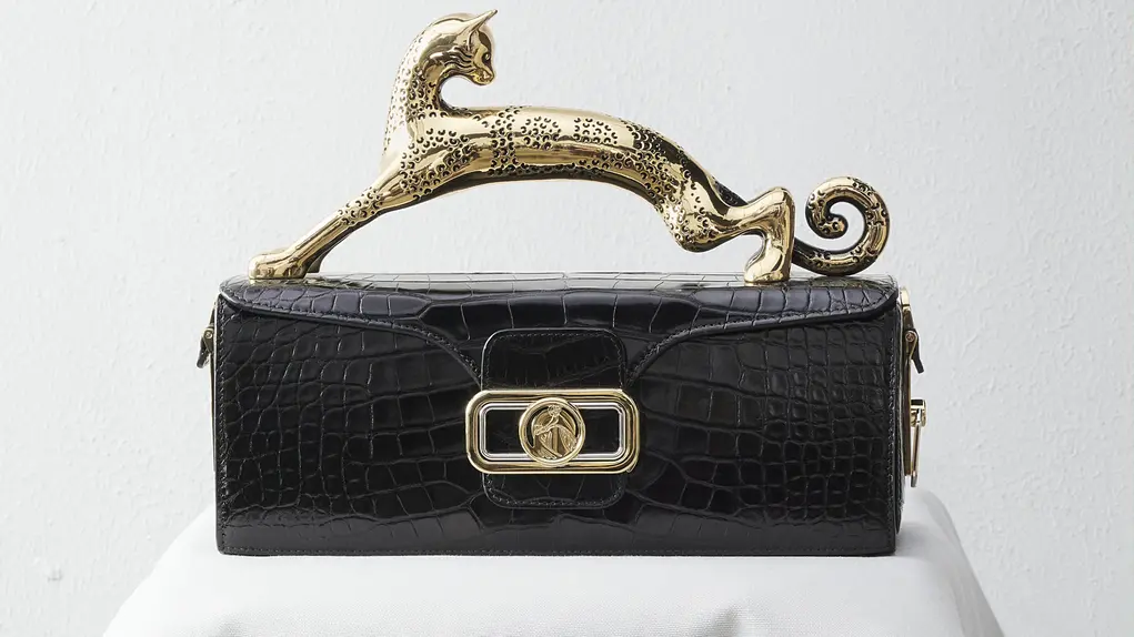 The Pencil Cat bag was inspired by Madame Lanvin’s boxes in which she stored her pencils and artistic tools, transforming it into a piece of Art, made by hand in Florence. The cat handle, is a sculpture inspired by a cat shaped andiron, designed by Armand-Albert Rateau.