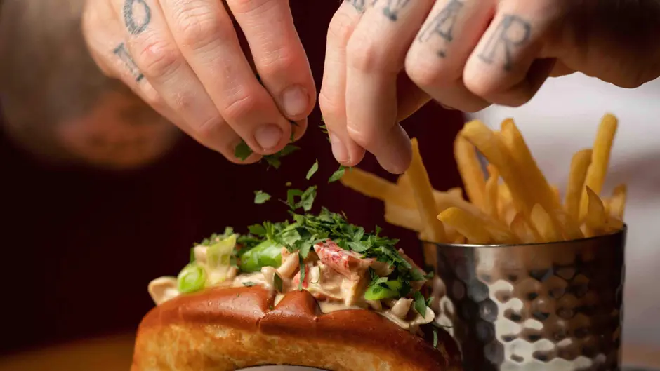 The restaurant’s iconic Lobster Roll has also been given a touch of Michelin-star magic via the ultimate surf and turf creation. Dive tastebuds first into the Roast Chicken Lobster Roll that matches succulent wild-caught lobster with a deeply satisfying roast chicken mayonnaise. Pickled shimeji mushrooms and chopped chervil provide a touch of acidity that perfectly cuts the richness. All are loaded into a pillowy brioche roll, topped with finely sliced blanched leeks and accompanied by crisp fries on the side.